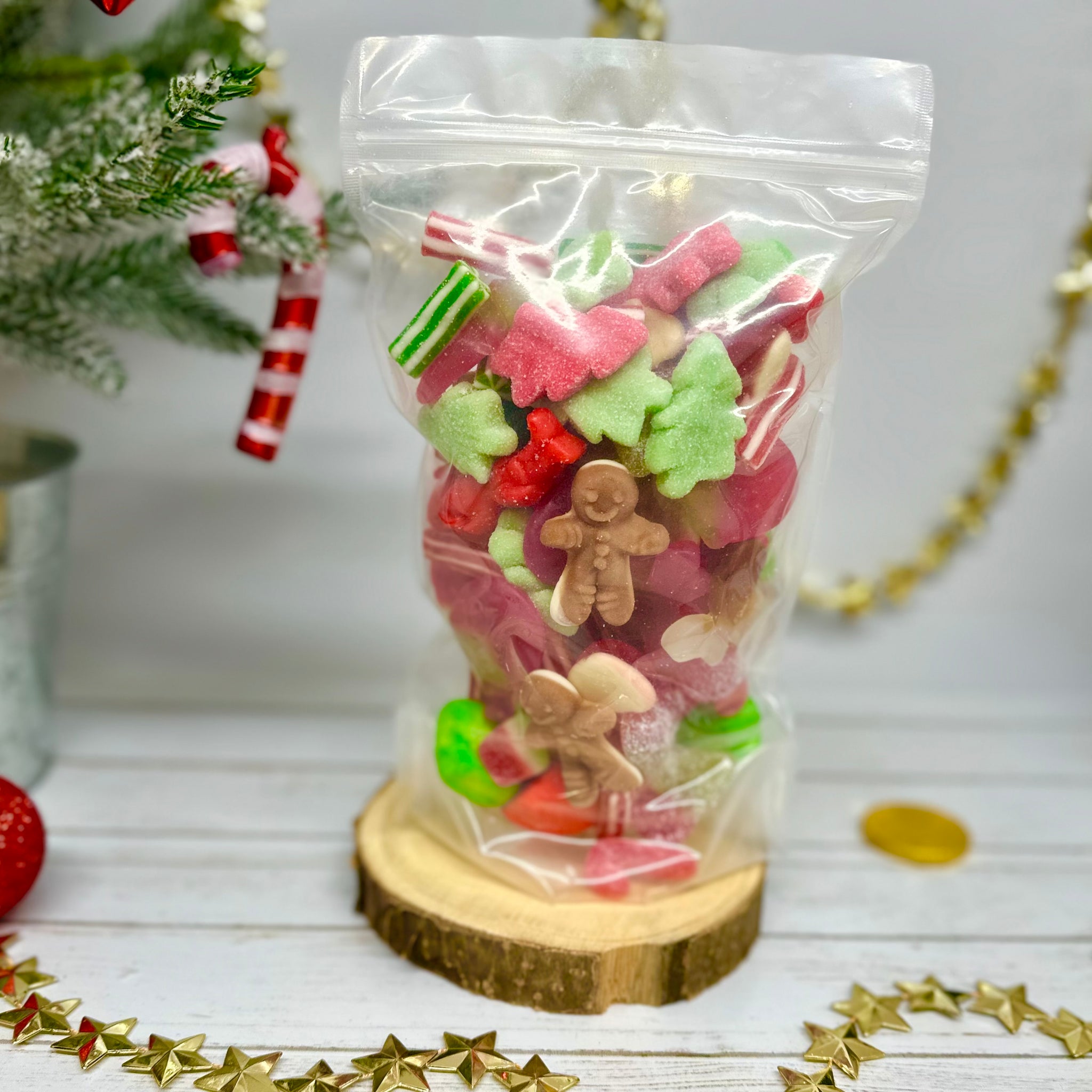 Christmas Pick'n'Mix sweet pouches filled with festive themed sweet varieties like Christmas Trees, Candy Poles, Candy Canes, Elves, Gingerbread Men, Holly, Reindeer and more!