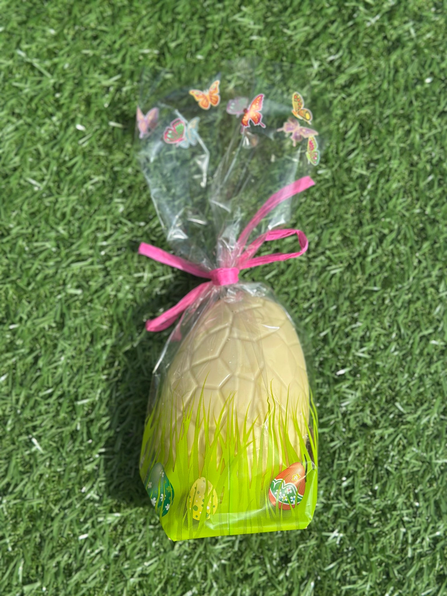 Unicorn themed easter egg made from a Belgian white chocolate 1/2 shell filled with 100 grams of strawberry and white chocolate buttons and hand decorated Una the Unicorn white chocolate figure. Packaged by hand.