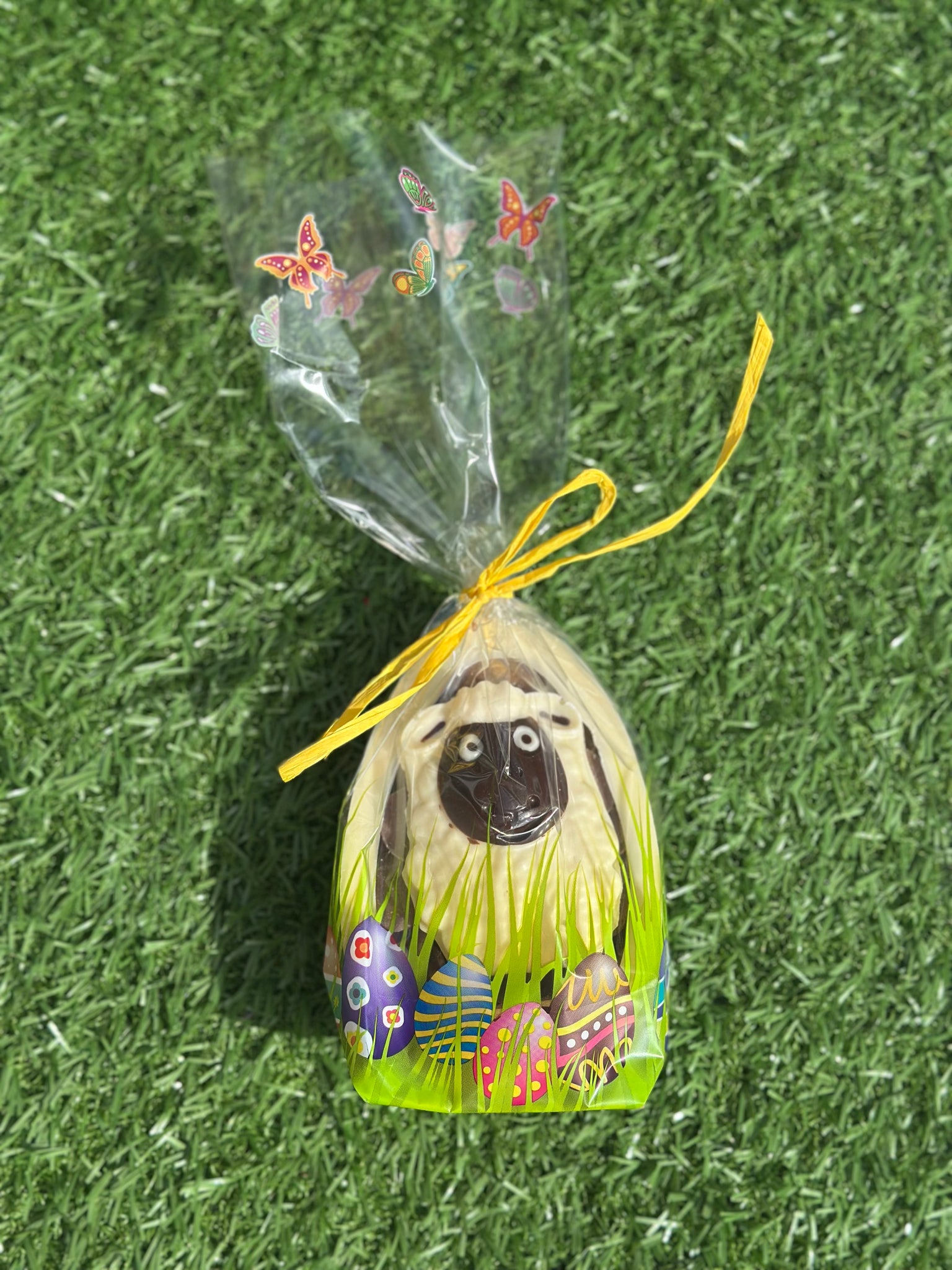 A belgian chocolate 1/2 white shell filled with milk chocolate buttons and a white chocolate sheep, such a cute Easter gift!
